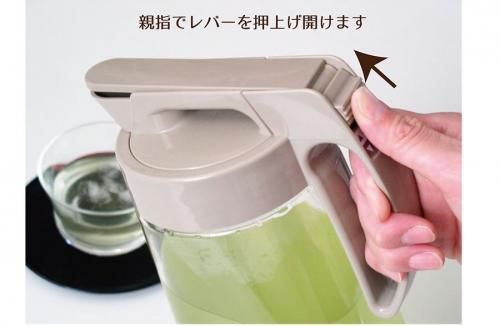 レバーの上下でフタの開閉ができます。 フタとパッキンが一体化したお手入れ簡単・清潔なパッキン一体型タテヨコピッチャーです。 フタが 1.6Lと2.1Lで同じ大きさの為、共用可能です。 水・お茶・コーヒー・ジュース・出汁などにご利用ください。 ※エンバランスタテヨコピッチャーには塩素等の除去作用はございません。