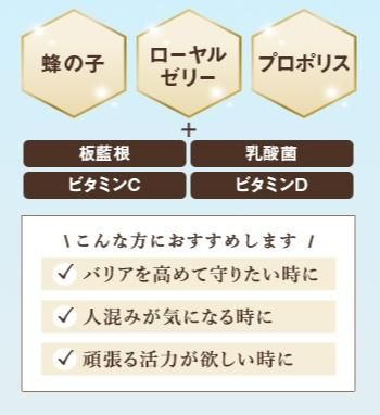 蜂の子、ローヤルゼリー、プロポリスといった3種類のみつばち由来原料に加え、板藍根、乳酸菌、ビタミンC、ビタミンDを配合。
